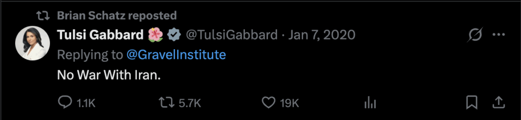 As Gabbard said in 2024: “A vote for Donald Trump is a vote to end wars, not start them.”