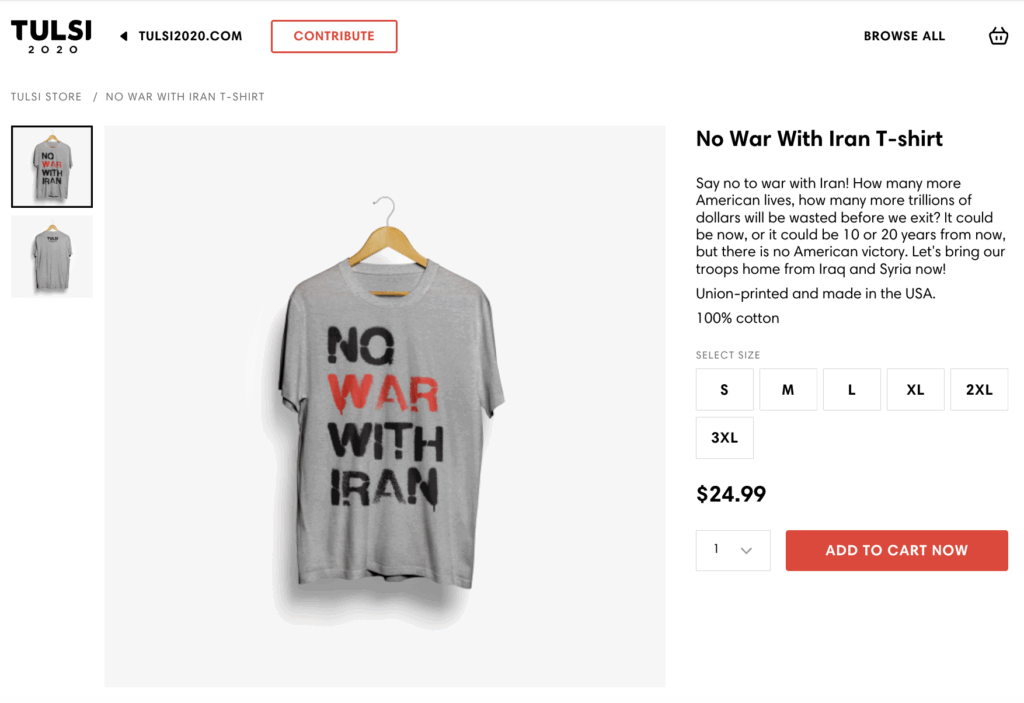 She was running for president at the time and that same week her presidential campaign started selling “No War With Iran” T-shirts for $24.99. Her Tulsi2020 website proclaimed: “How many more American lives, how many more trillions of dollars will be wasted before we exit? It could be now, or it could be 10 or 20 years from now, but there is no American victory.”